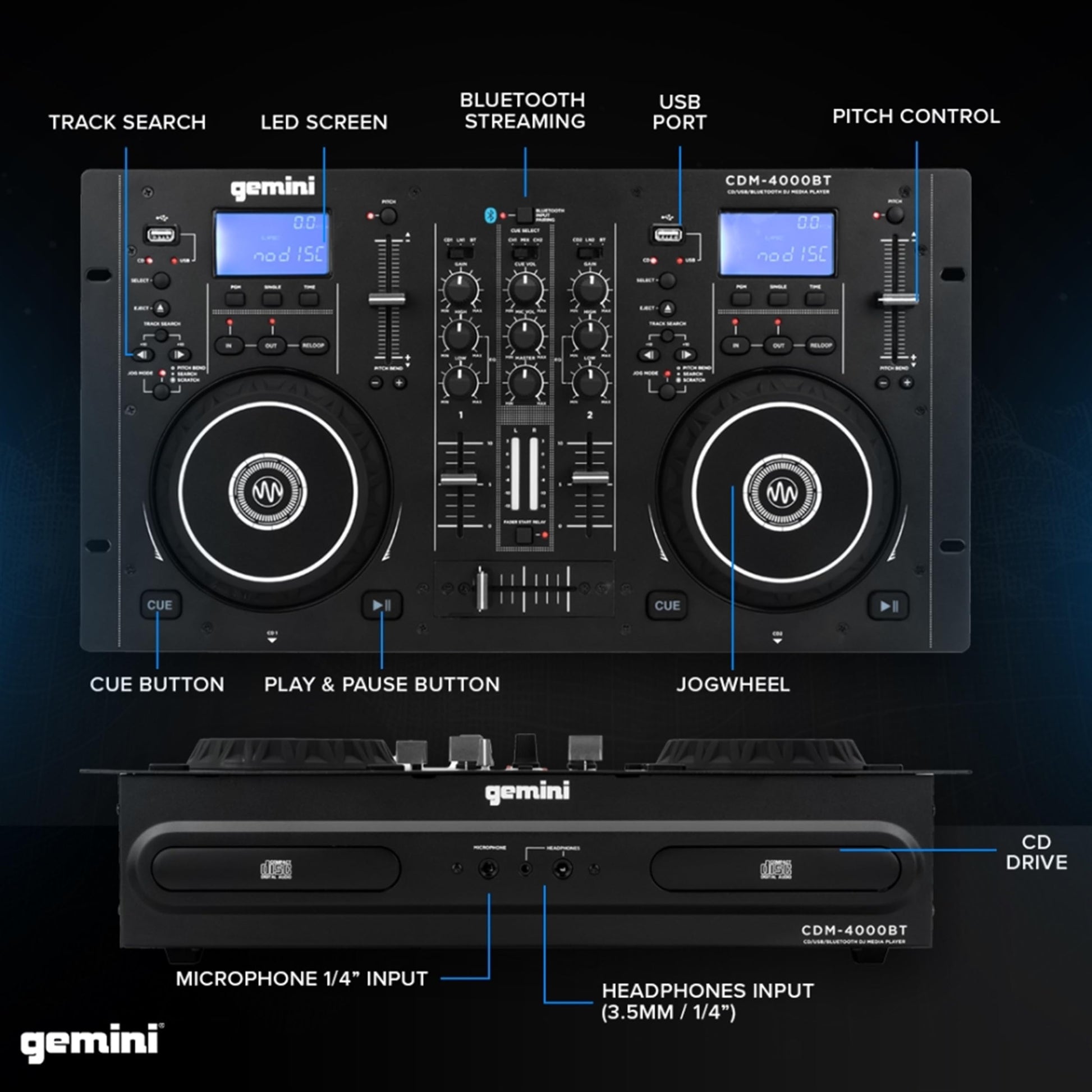 Gemini Sound Cdm-4000Bt Stand Alone Bluetooth Streaming Professional Dj Dual Deck Media Player Mixer Cd/Cdr USB Playback 2 Band EQualizer Manual Looping Sensitive Jog Wheels, Xlr Output, Anti-Shock