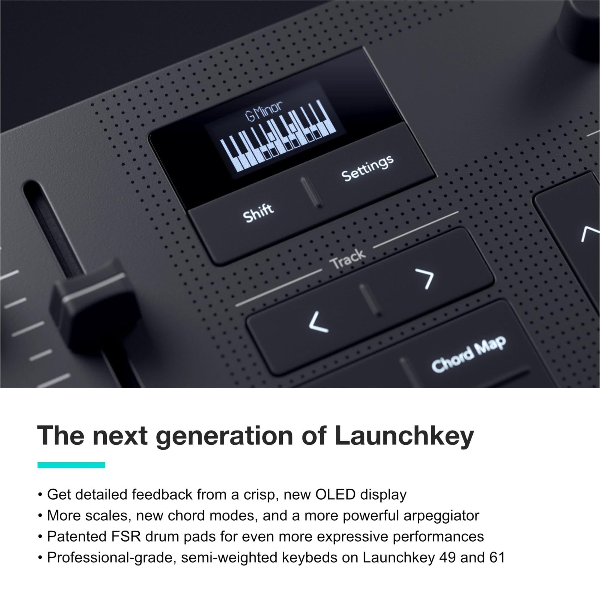 Details: Launchkey 61 is a powerful DAW controller with a suite of onboard creation tools. Every element has been designed to feel musical, expressive, and razor focused on creative flow; from the semi-weighted keybed and 16 pads with polyphonic aftertouch, to the carefully laid out control surface with in-depth DAW integration. Play instruments and drums, launch clips and scenes, and get instant hands-on control of your DAW’s mixer, devices, and effects. Launchkey also has a unique, editable Arpeggiator, three Chord Modes to quickly create musical progressions, a Scale Mode that keep you in the right key, and a Chord Detector that shows what chord is currently being played on the OLED display.